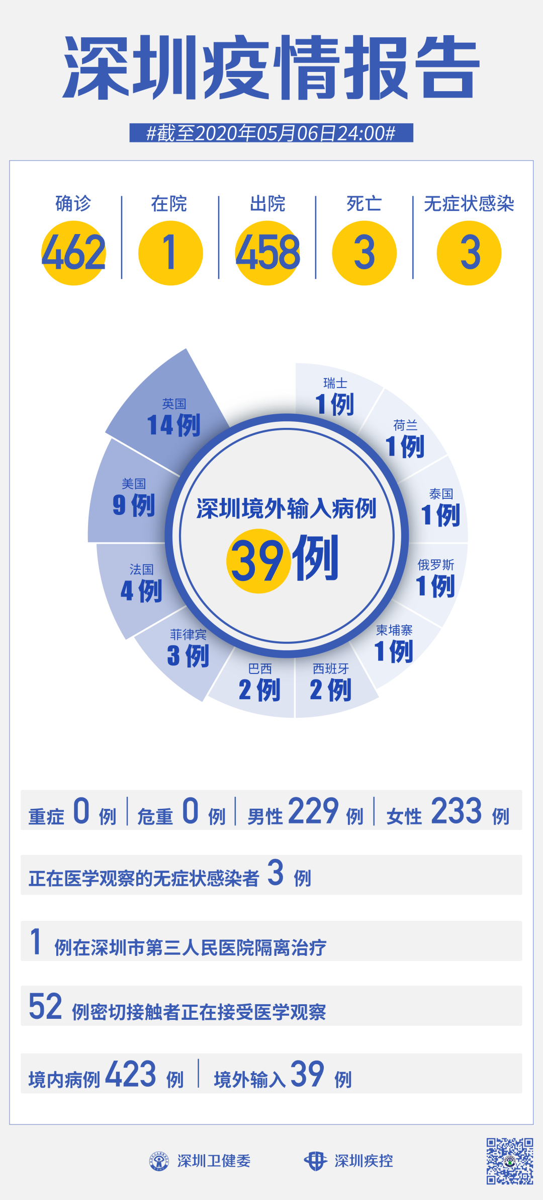 截至5月6日24時,深圳累計報告新冠肺炎病例462例。在院治療僅有1例。