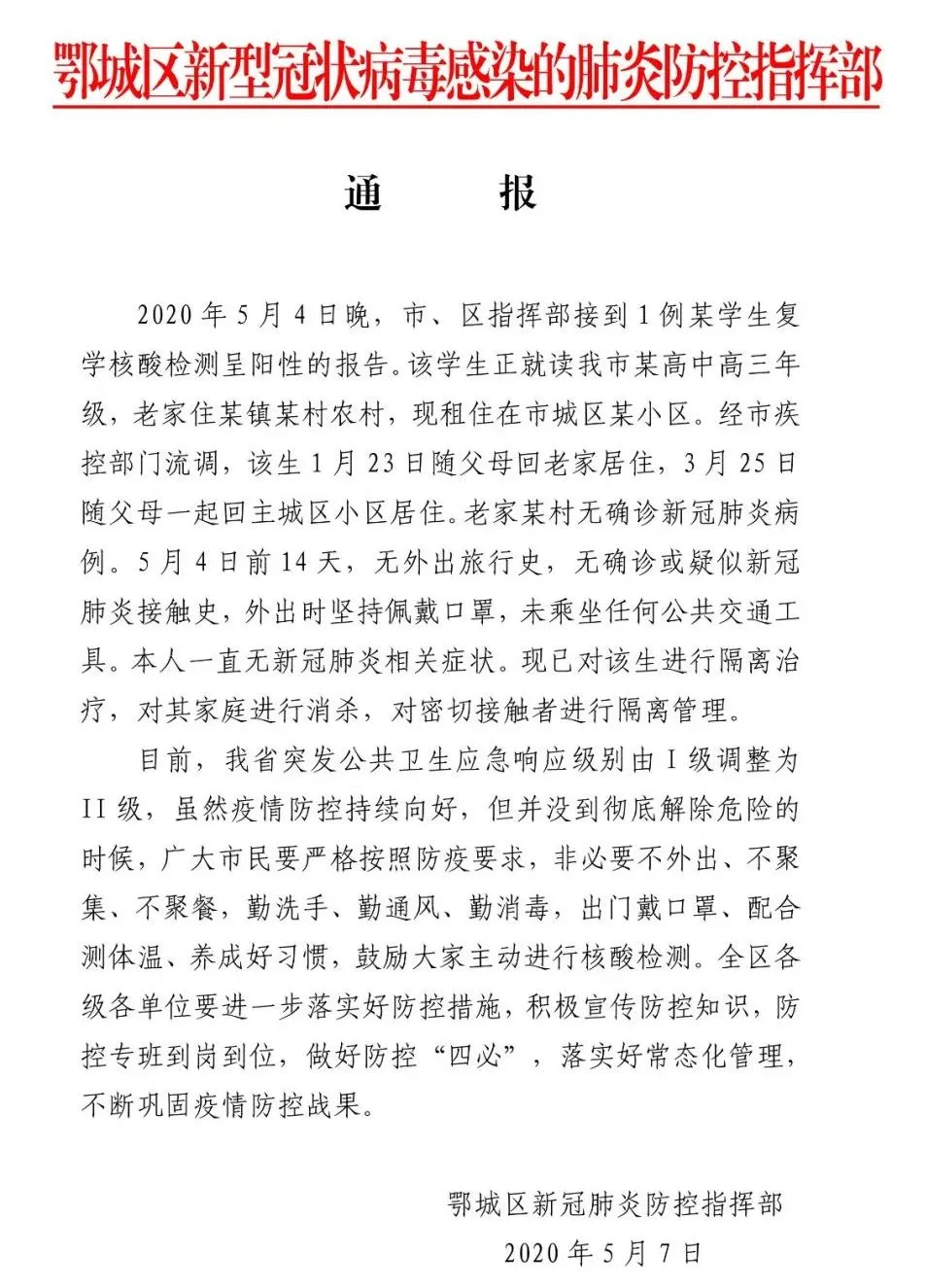 5月8日,湖北鄂州市鄂城區(qū)政府網(wǎng)站發(fā)布一則鄂城區(qū)新冠肺炎防控指揮部通報。