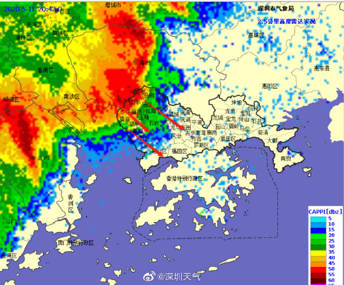 20時56分:目前強雷雨云團(tuán)已開始影響寶安北部,未來一小時強雷雨自西向東影響寶安、光明、龍華、南山、福田、羅湖區(qū),上述區(qū)域最大小時雨量30-40毫米,請大家注意做好防御。