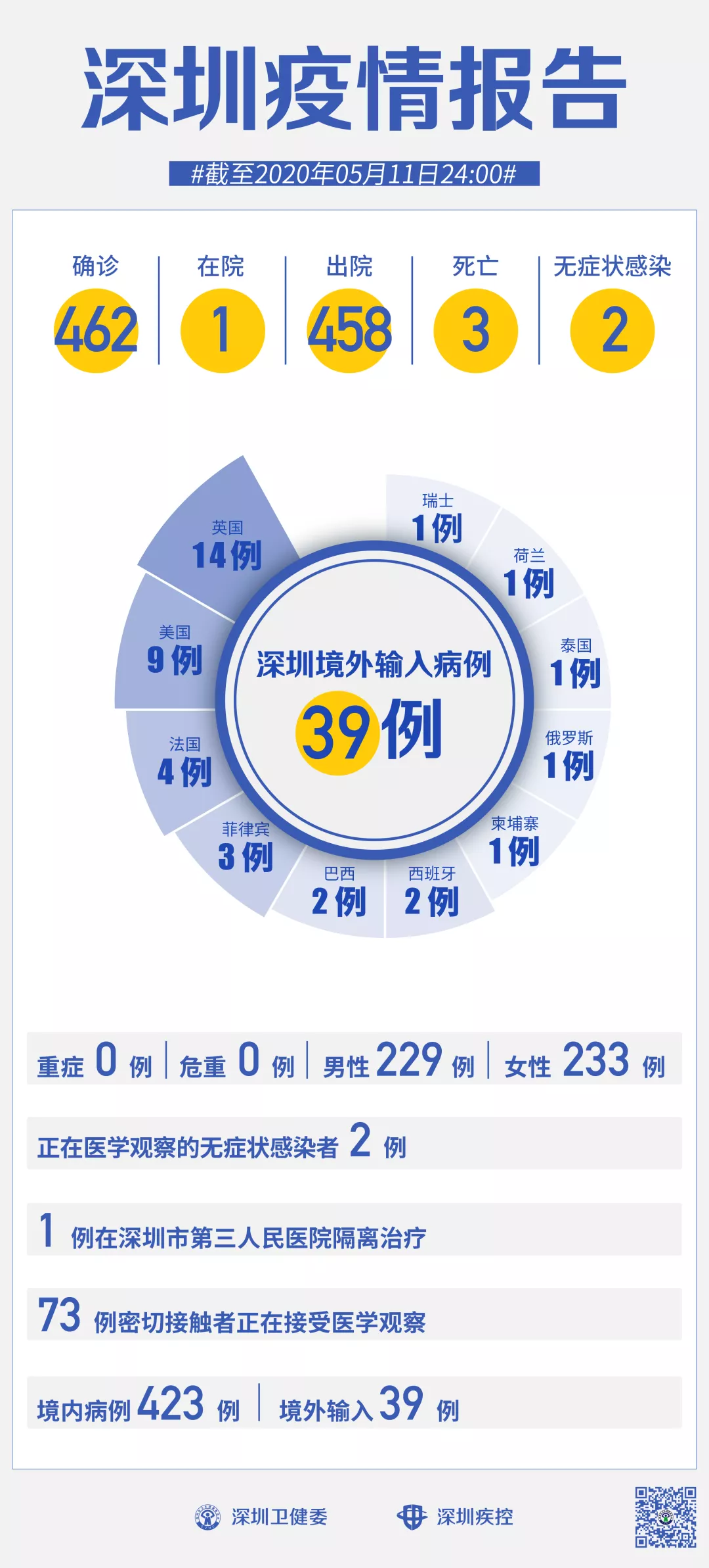 截至5月11日24時,深圳累計報告新冠肺炎病例462例。