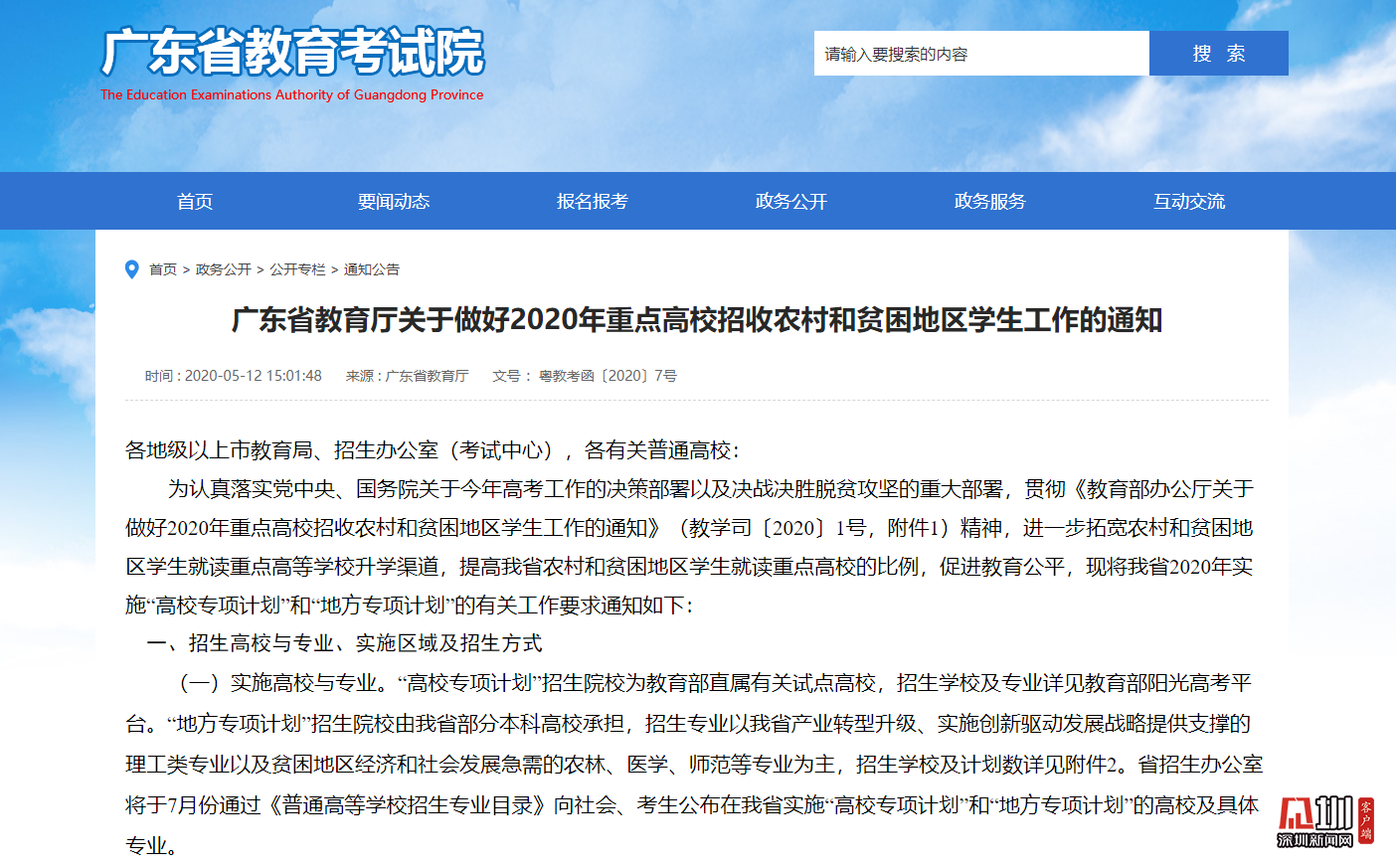 見圳客戶端·深圳新聞網(wǎng)2020年5月13日訊(見圳客戶端、深圳新聞網(wǎng)記者 吳英敏 金洪竹)5月13日,記者從廣東省教育廳獲悉,為進(jìn)一步拓寬農(nóng)村和貧困地區(qū)學(xué)生就讀重點(diǎn)高等學(xué)校升學(xué)渠道,提高廣東省農(nóng)村和貧困地區(qū)學(xué)生就讀重點(diǎn)高校的比例,促進(jìn)教育公平,2020年廣東省將實(shí)施“高校專項計劃”和“地方專項計劃”,做好重點(diǎn)高校招收農(nóng)村和貧困地區(qū)學(xué)生工作。