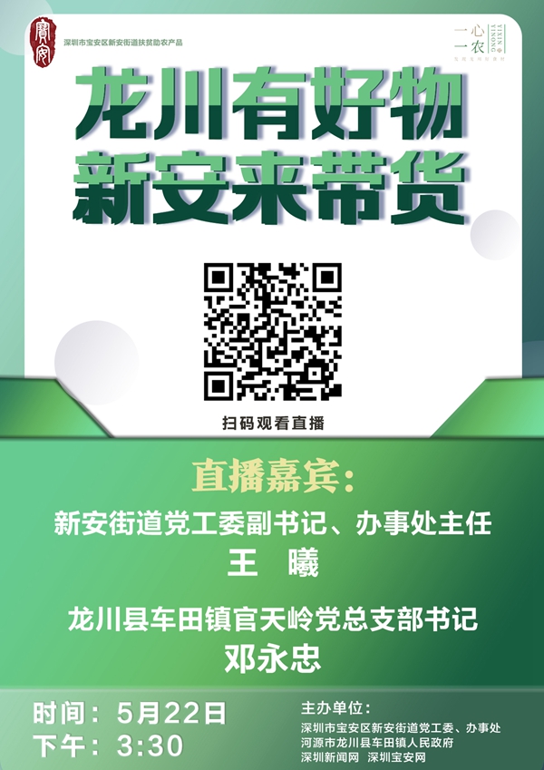 5月22日下午3:30,新安街道黨工委副書(shū)記、辦事處主任王曦、龍川縣車(chē)田鎮(zhèn)官天嶺村支部書(shū)記鄧永忠還將作客深圳新聞網(wǎng)直播間,向網(wǎng)友推介綠殼雞蛋、黑豆腐竹、生態(tài)米、牛?;ㄉ葍?yōu)質(zhì)農(nóng)產(chǎn)品,通過(guò)電商打通貧困村農(nóng)產(chǎn)品銷(xiāo)售渠道。歡迎觀看,不見(jiàn)不散!