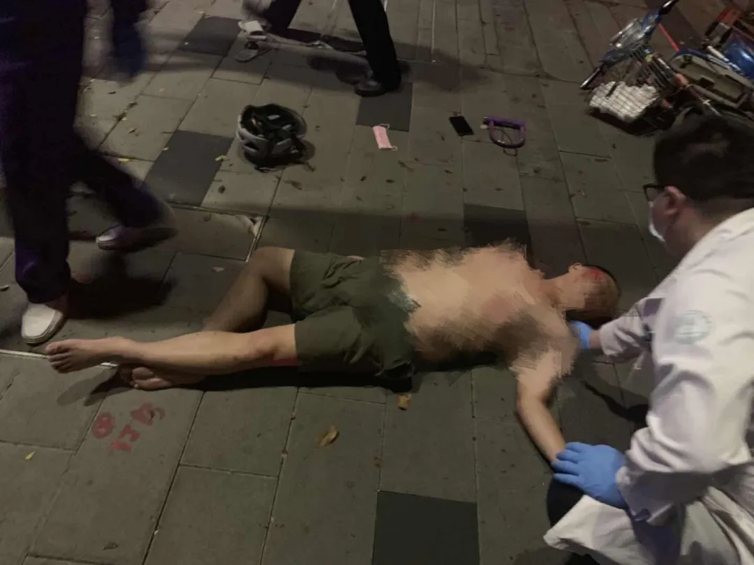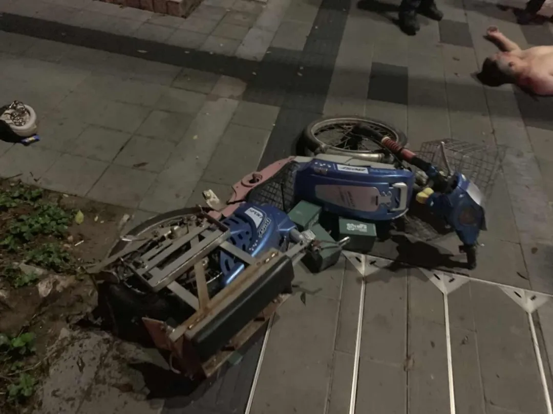 該男子上半身裸露橫躺在人行道上,而且臉上、身上多處擦傷,右眼淤青紅腫,旁邊還有一輛損壞的兩輪電動車,坐墊、鎖鏈、頭盔散落一地。