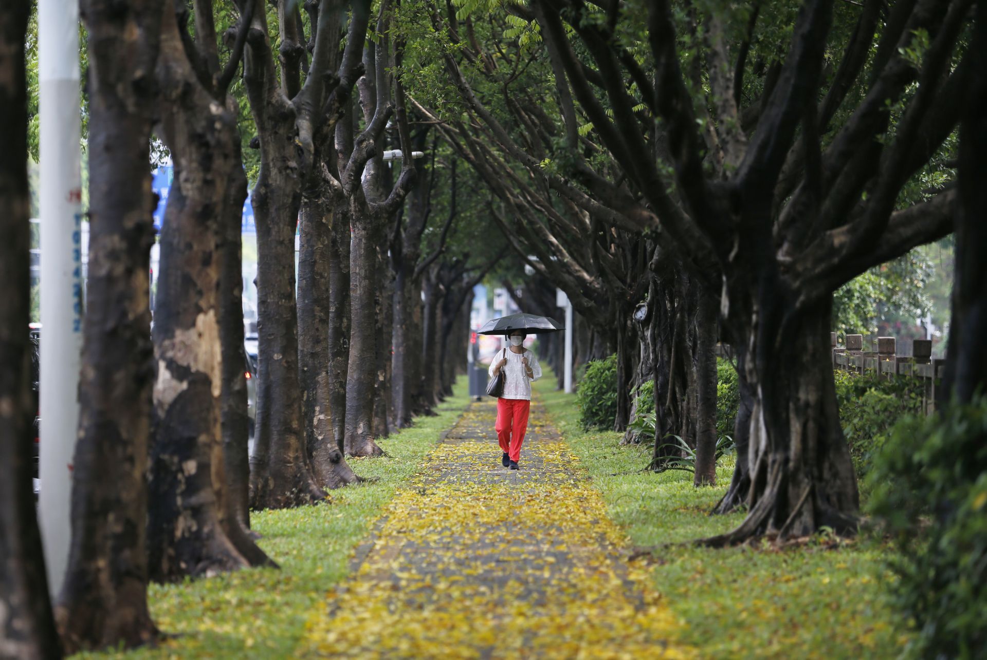 2020年5月26日中午13:46分,商報(bào)東二路附近,短時(shí)強(qiáng)降水加上刮風(fēng),路面上都是樹葉,一位市民經(jīng)過(guò)。