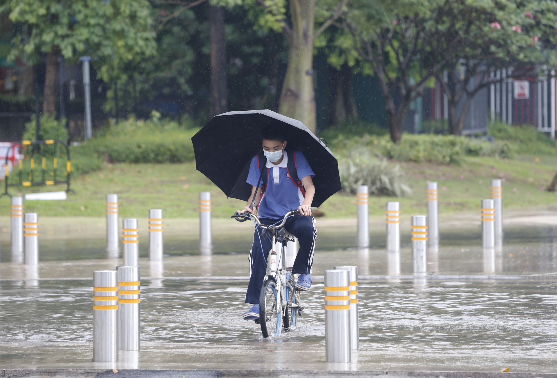 2020年5月26日中午13:46分,商報(bào)東二路,短時(shí)強(qiáng)降水導(dǎo)致路面水浸,一位騎士經(jīng)過(guò)水浸路面。