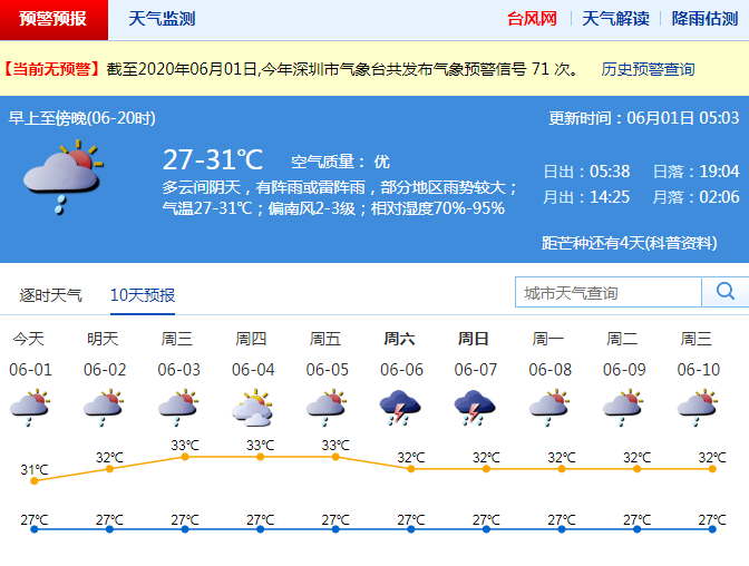 深圳市氣象臺預(yù)報,未來一周我市天氣仍不穩(wěn)定,雷雨多發(fā)。6月1日至5日,多云有陣雨或雷陣雨,局地雨勢較大,天氣漸趨悶熱。目前我市處于龍舟水降水多發(fā)季節(jié),需特別關(guān)注降雨給交通帶來的影響。請市民及時關(guān)注市氣象臺發(fā)布的最新氣象監(jiān)測預(yù)報和預(yù)警信息。