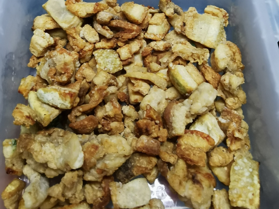 ▲爸爸媽媽童年最?lèi)?ài)的零食是豬油渣,越嚼越香。