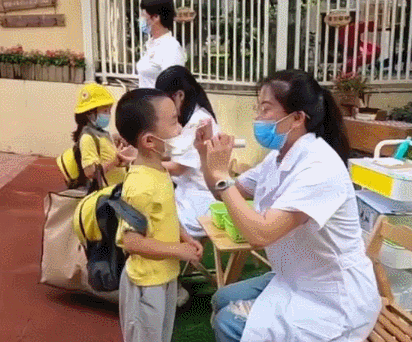 老師依次對(duì)孩子進(jìn)行體溫檢測
