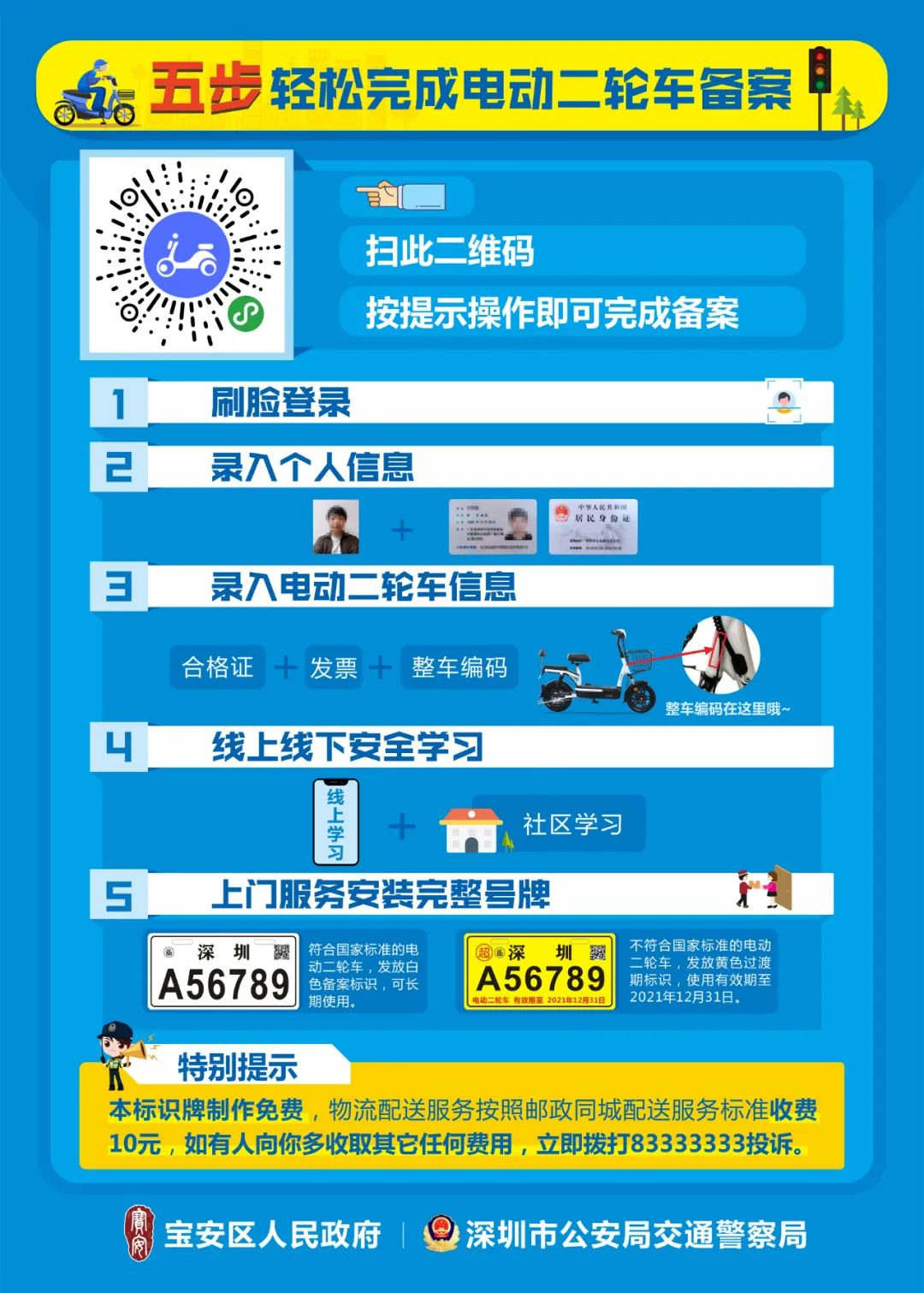 見圳客戶端·深圳新聞網(wǎng)2020年6月2日訊(見圳客戶端、深圳新聞網(wǎng)記者 鄭曉鵬)近日,網(wǎng)上流傳著這樣一張圖片,圖片上稱,6月1日起寶安、光明電動(dòng)二輪車備案通道要關(guān)閉了。消息一出,便引起網(wǎng)友的廣泛關(guān)注“真的假的?”“那我的電動(dòng)車還能上牌嗎?”“超標(biāo)車是什么車?合標(biāo)車又是什么車?”……記者從深圳市交警局獲悉,6月15日起,寶安區(qū)和光明區(qū)超標(biāo)的電動(dòng)二輪車將不再予以發(fā)放黃色過渡期標(biāo)識(shí);對(duì)于符合新國標(biāo)標(biāo)準(zhǔn)的車輛,市民持深圳戶籍身份證或居住證即可辦理電動(dòng)二輪車備案,發(fā)放可長期使用的白色標(biāo)識(shí)。已備案的并發(fā)放黃牌標(biāo)識(shí)的車輛仍可繼續(xù)使用,過渡期至2021年12月31日。