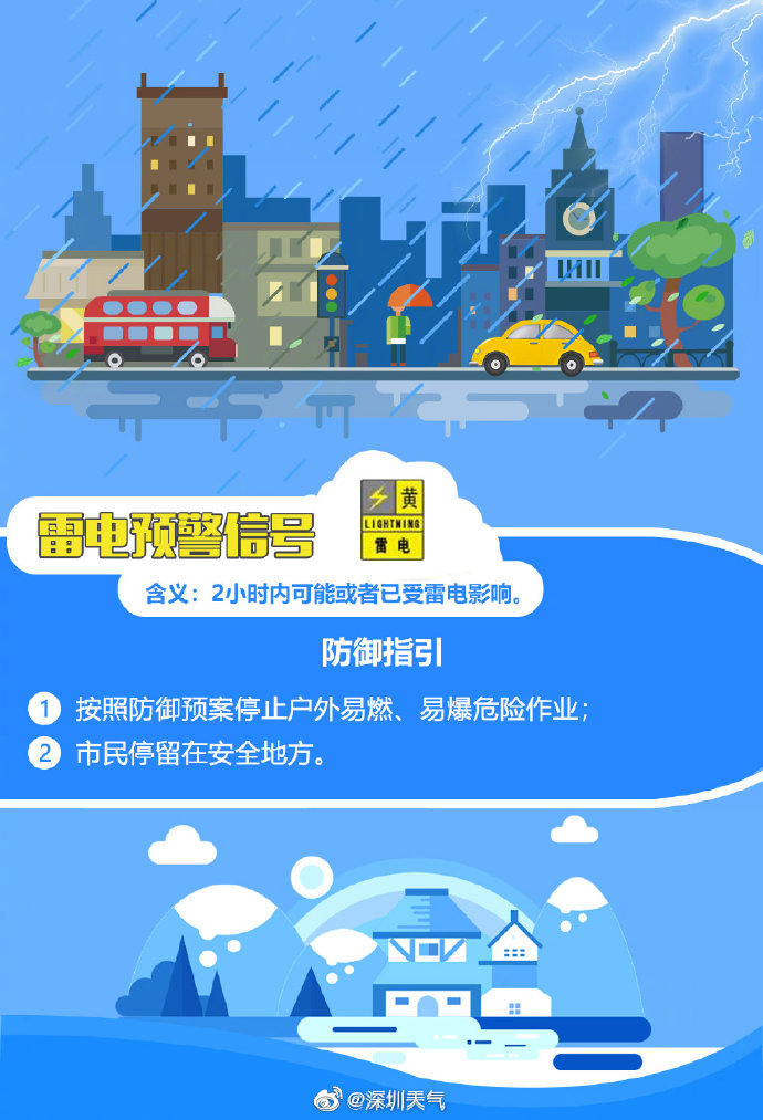 深圳市氣象臺于2020年06月05日11時15分在全市發(fā)布雷電預警,預計2小時內(nèi)全市將受雷電影響,市民停留在安全地方;按照防御預案停止戶外易燃易爆危險作業(yè),并加強?;瘓鏊踩芾?。