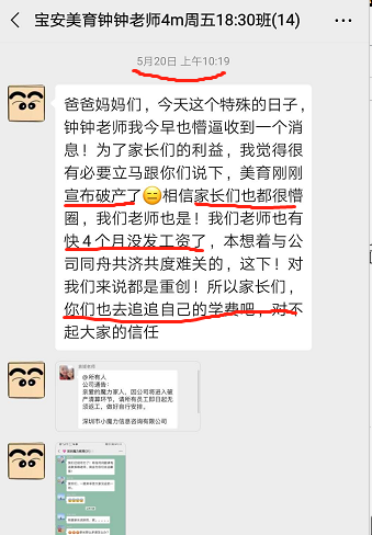 一名丁姓家長介紹,5月20日,家長接到美育老師消息,稱公司剛剛宣布破產(chǎn),老師工資被拖欠4個月。家長介紹,老師曝光該消息后,培訓(xùn)機構(gòu)支付了他們的拖欠工資。隨后大量老師離職。