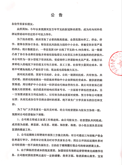 公司6月5日對家長發(fā)的公告1。家長提供。