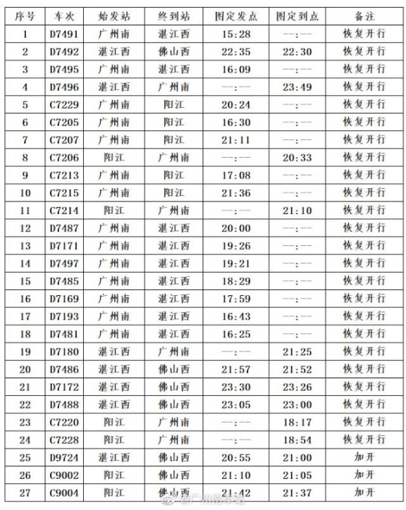 其中,廣州南站恢復(fù)開行列車24趟,其中始發(fā)列車14趟,跨線列車4趟,終到列車6趟;同時(shí)加開跨線列車3趟,恢復(fù)開行和加開列車共計(jì)27趟。