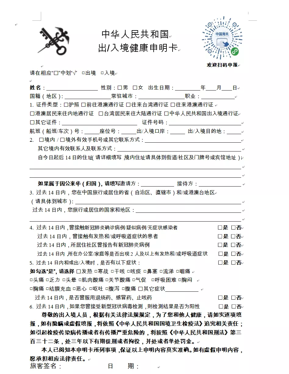 一、請?zhí)崆跋螺d打印《健康申明卡》(見附件1),或關(guān)注“海關(guān)旅客指尖服務(wù)小程序”(見附件2)。提前如實(shí)填寫紙質(zhì)或電子健康申報(bào)信息,通關(guān)時(shí)主動(dòng)向海關(guān)申報(bào)。