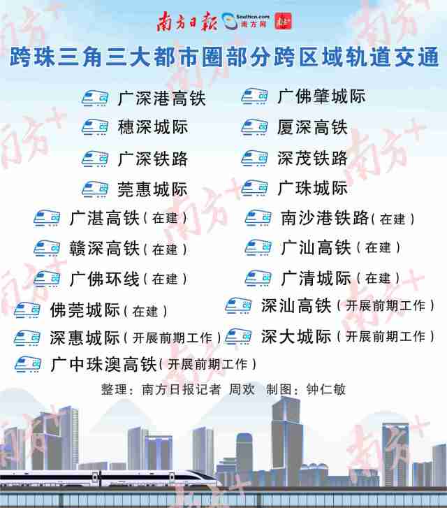 在珠三角,軌道交通也在緊鑼密鼓推進。設計時速350公里的兩條大動脈——連接深圳、東莞、惠州、河源的贛深高鐵,及連接廣州、惠州、汕尾的廣汕高鐵,正加快建設,分別計劃2021年、2022年建成。屆時,這些城市可1小時內(nèi)互通。