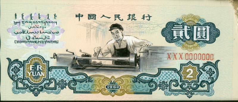 第三套人民幣2元票面總體設(shè)計(jì)手繪原大效果圖。