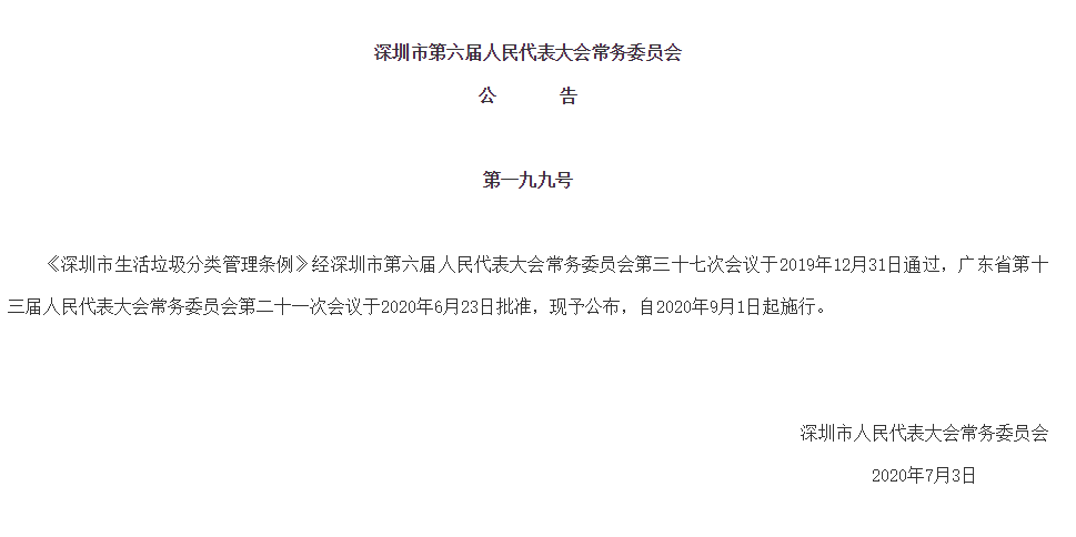 見圳客戶端·深圳新聞網(wǎng)2020年7月4日訊(見圳客戶端、深圳新聞網(wǎng)記者 葉梅)記者從深圳市人大常委會官方網(wǎng)站獲悉,《深圳市生活垃圾分類管理條例》(以下簡稱《條例》)經(jīng)深圳市第六屆人民代表大會常務(wù)委員會第三十七次會議于2019年12月31日通過,廣東省第十三屆人民代表大會常務(wù)委員會第二十一次會議于2020年6月23日批準(zhǔn),將于2020年9月1日起施行,從垃圾分類投放、收集運(yùn)輸處理、源頭減量和循環(huán)利用等方面提出了明確要求。