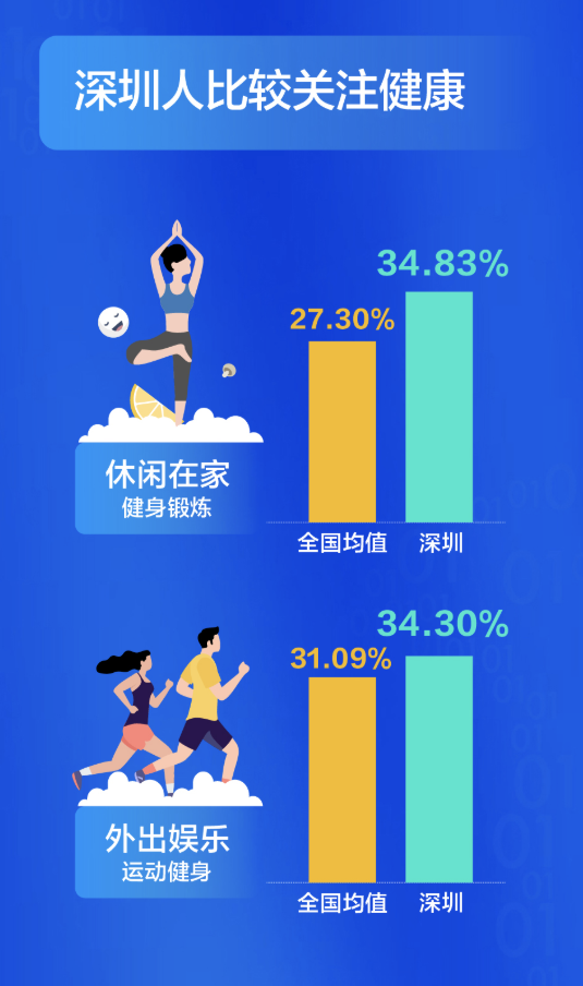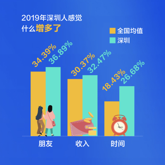 深圳人比較關(guān)注健康,不管是宅在家還是外出娛樂,他們選擇運(yùn)動(dòng)健身的比例都超過全國平均水平,對健康的投資,成就了又一個(gè)“苗條之城”。過去這一年,有四成的深圳人感覺自已“輕松”了,體重減少的人群比例高出全國近14個(gè)百分點(diǎn)。甩掉了贅肉的同時(shí),深圳人還感覺在時(shí)間、朋友、收入這三方面的收獲在增加。尤其是時(shí)間,超出了全國均值8個(gè)百分點(diǎn)。