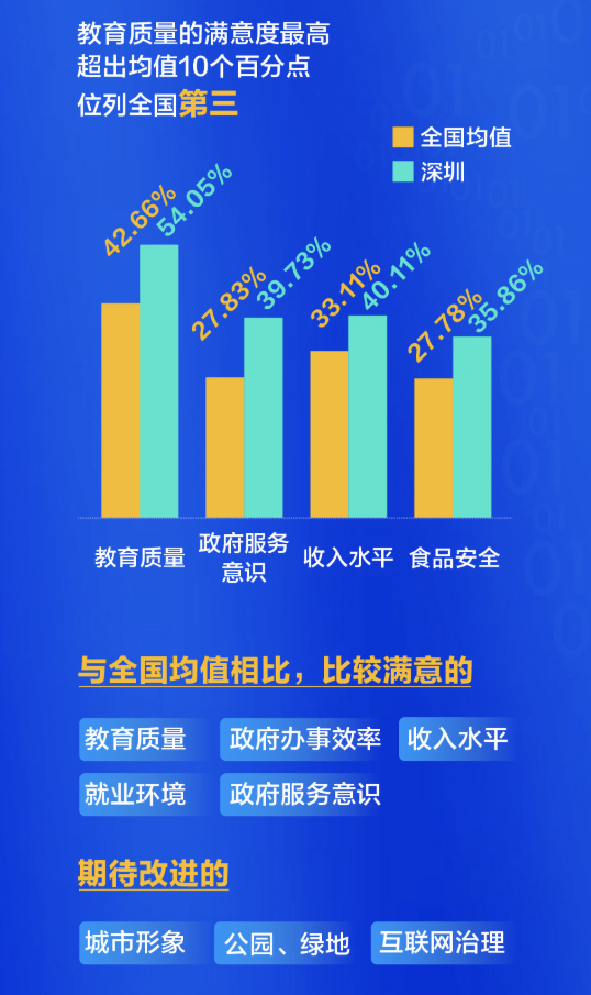 在針對城市治理能力和社會(huì)服務(wù)的20多項(xiàng)滿意度指標(biāo)中,深圳有19項(xiàng)高于全國省會(huì)城市和直轄市平均水平。其中,市民對教育服務(wù)的滿意度最高,超出均值10個(gè)百分點(diǎn),位列全國第三,其次是治安狀況和水、空氣質(zhì)量,而在政府服務(wù)意識和食品安全的滿意度,也排在全國同類第一名。此外,日常生活中的收入和就業(yè),也讓深圳人感覺比較踏實(shí)。