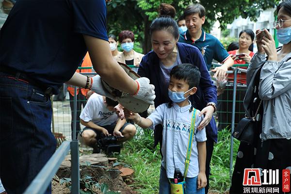 在眾人的見(jiàn)證下,兩朵靈芝從刀刃中落下,圍觀的市民面露豐收的喜悅,紛紛伸手觸摸以沾福氣,還有拉著襁褓嬰兒的手去摸靈芝的,更有市民高呼“摸靈芝,沾福氣”。