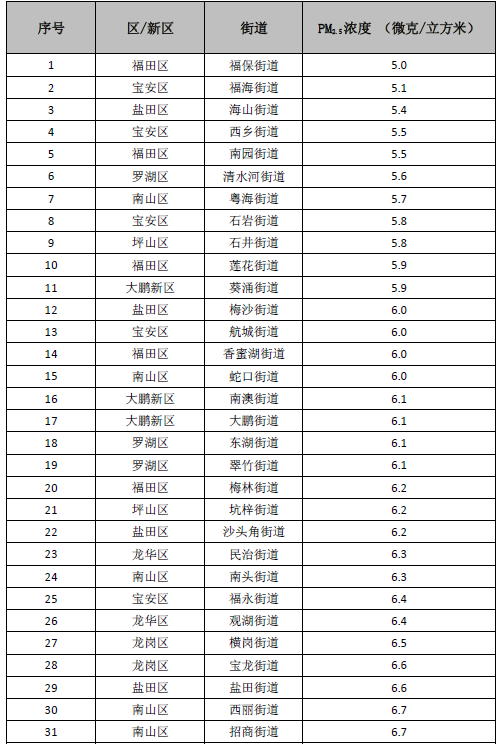 排名前十的街道是:福保街道、福海街道、海山街道、西鄉(xiāng)街道、南園街道、清水河街道、粵海街道、石巖街道、石井街道和蓮花街道;排名倒數(shù)后十的是:觀瀾街道、坪地街道、龍?zhí)锝值?、大浪街道、馬田街道、公明街道、龍崗街道、龍華街道、沙井街道和鳳凰街道。