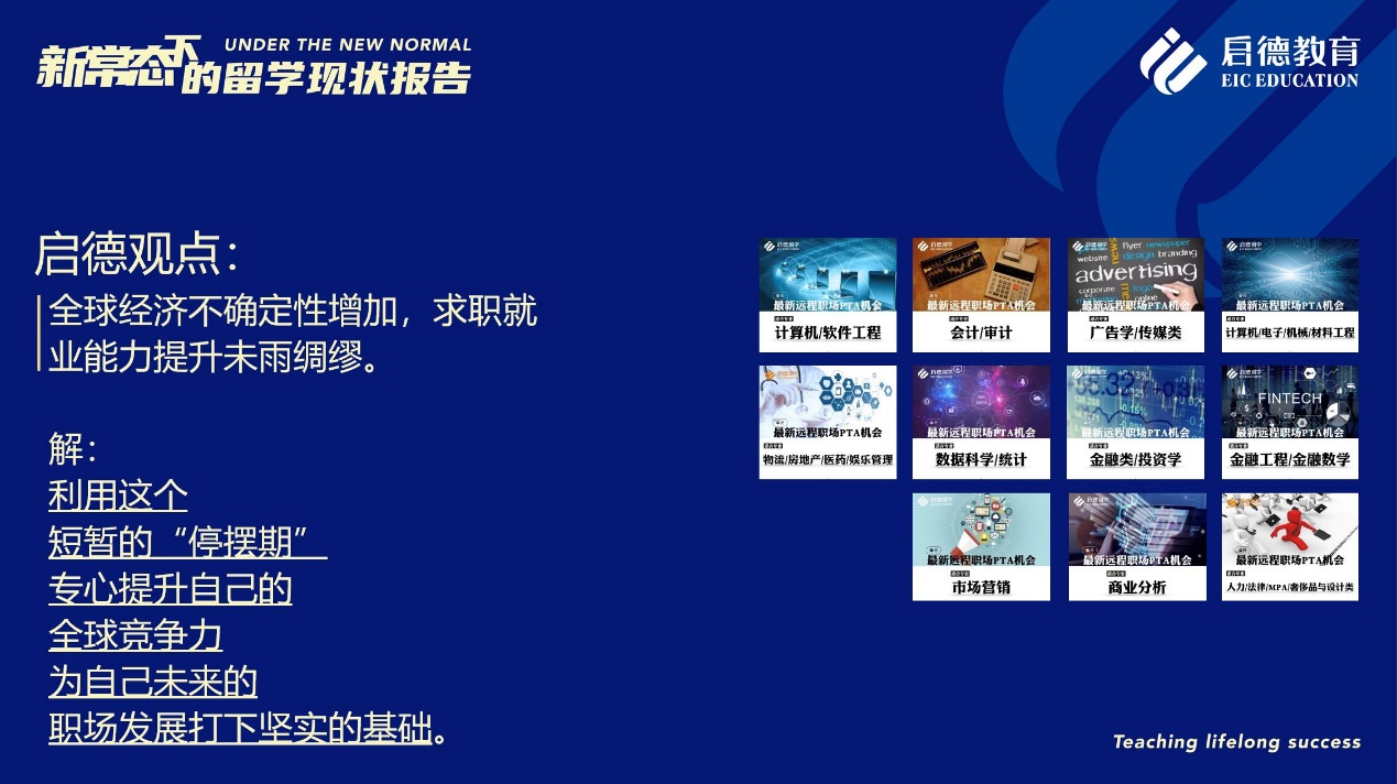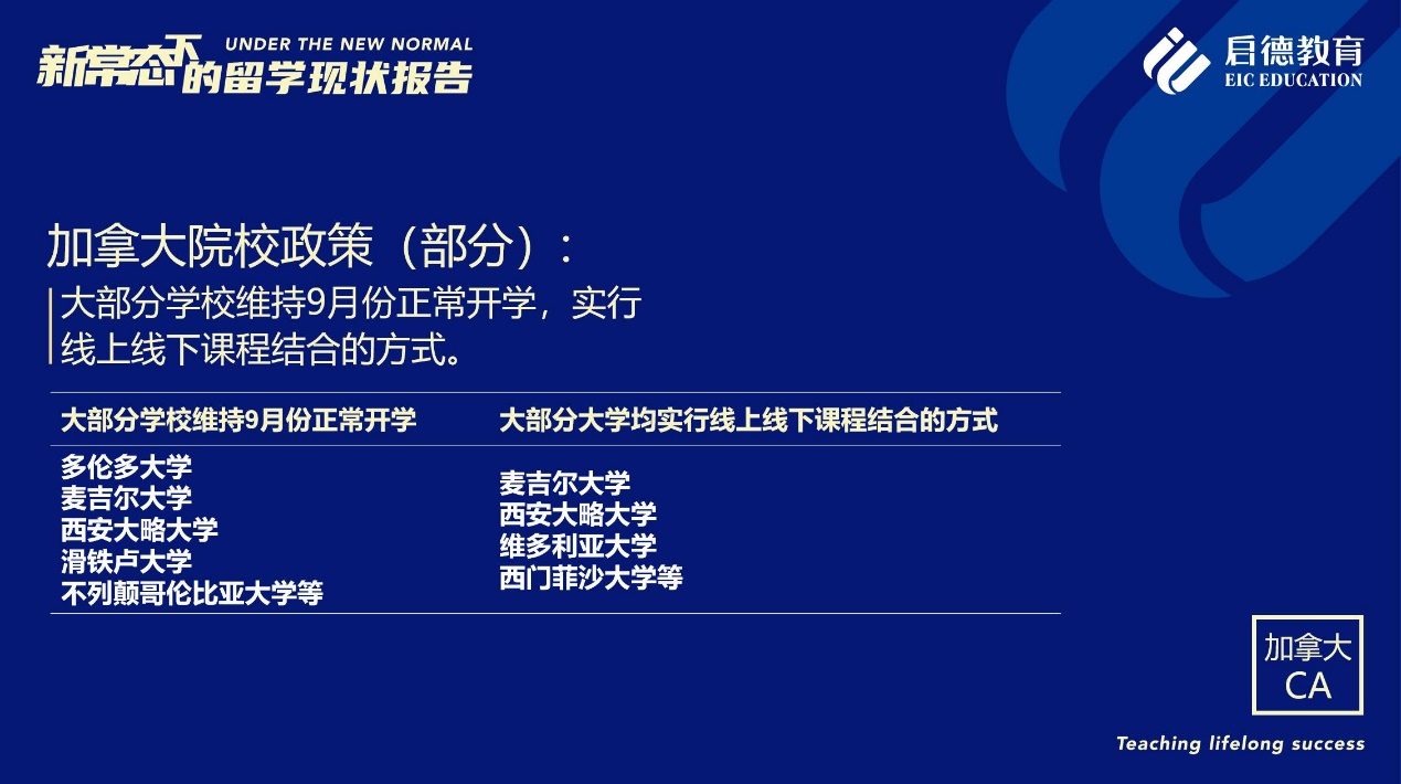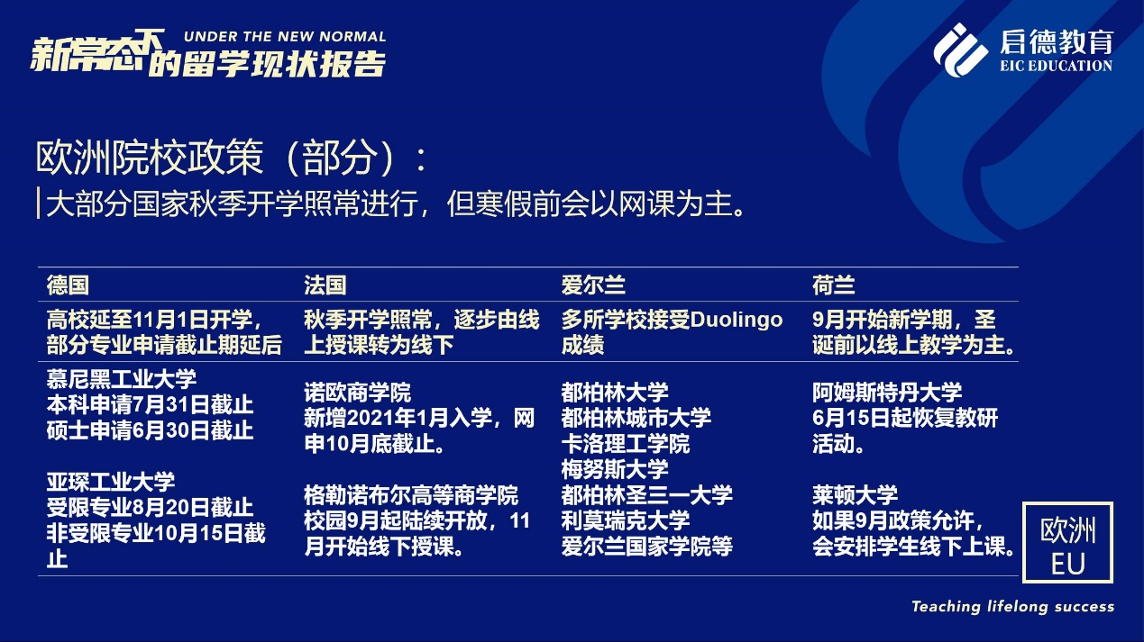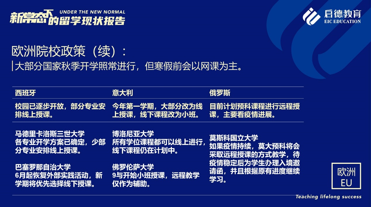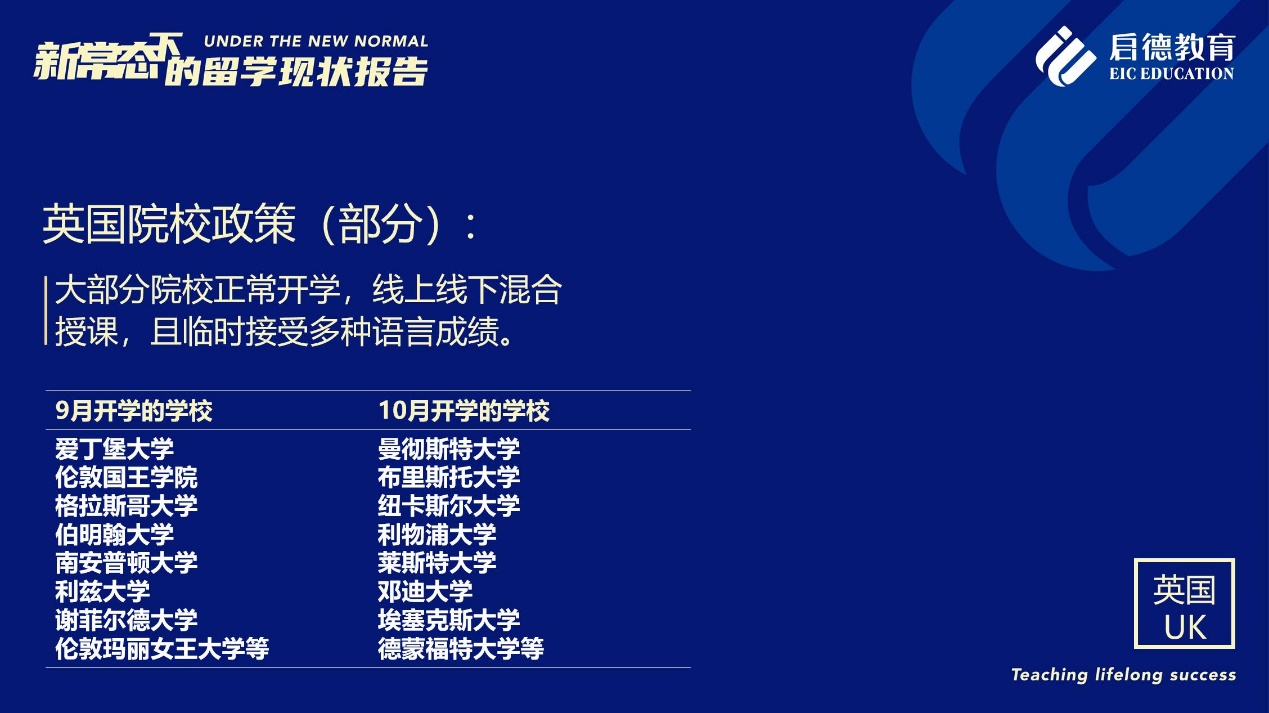 《報(bào)告》也梳理了近期各主要留學(xué)目的國(guó)及院校針對(duì)國(guó)際學(xué)生出臺(tái)的各類政策。據(jù)啟德留學(xué)英愛項(xiàng)目總監(jiān)孫波介紹,國(guó)內(nèi)英國(guó)簽證中心已經(jīng)重新開放。準(zhǔn)備赴英讀研的學(xué)生,部分大學(xué)明確表示秋季可以正常開學(xué),大課將會(huì)采用線上授課的方式,小班授課線下進(jìn)行;還有部分大學(xué)向?qū)W生提供更加靈活的入讀方案,學(xué)生可以選擇9月入讀或者1月入讀。此外,從2021年開始,在英國(guó)完成博士學(xué)位的國(guó)際學(xué)生將會(huì)獲得3年有效期的 PSW工作簽證,本科生和碩士生可以獲得2年有效期的 PSW工作簽證。