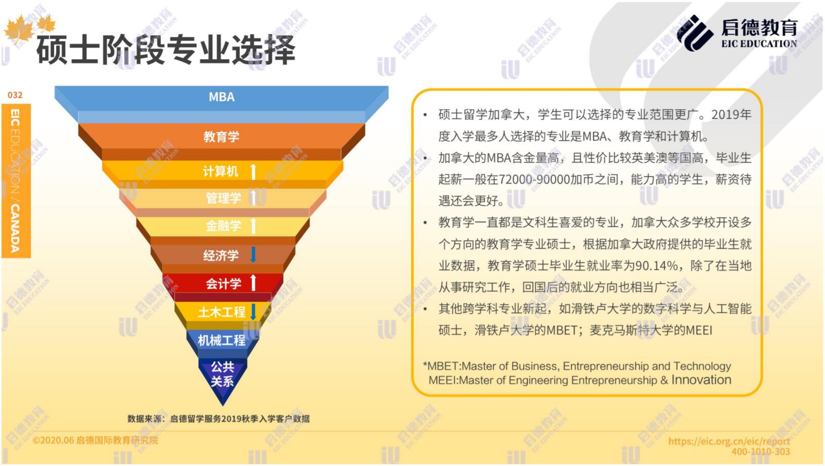 啟德加拿大2019秋季入學(xué)客戶服務(wù)數(shù)據(jù)顯示,在本科階段專業(yè)選擇理工科占比42%,商科占比37.1 %,文科19.1%,理工科的申請(qǐng)人數(shù)超過了商科。碩士階段選擇最多的專業(yè)是 MBA、教育學(xué)和計(jì)算機(jī),其他新興的跨學(xué)科專業(yè)包括滑鐵盧大學(xué)的數(shù)字科學(xué)與人工智能專業(yè)和商業(yè)、創(chuàng)業(yè)和技術(shù)專業(yè)( MBET ),麥克馬斯特大學(xué)的工程、創(chuàng)業(yè)與創(chuàng)新專業(yè)( MEEI )。
