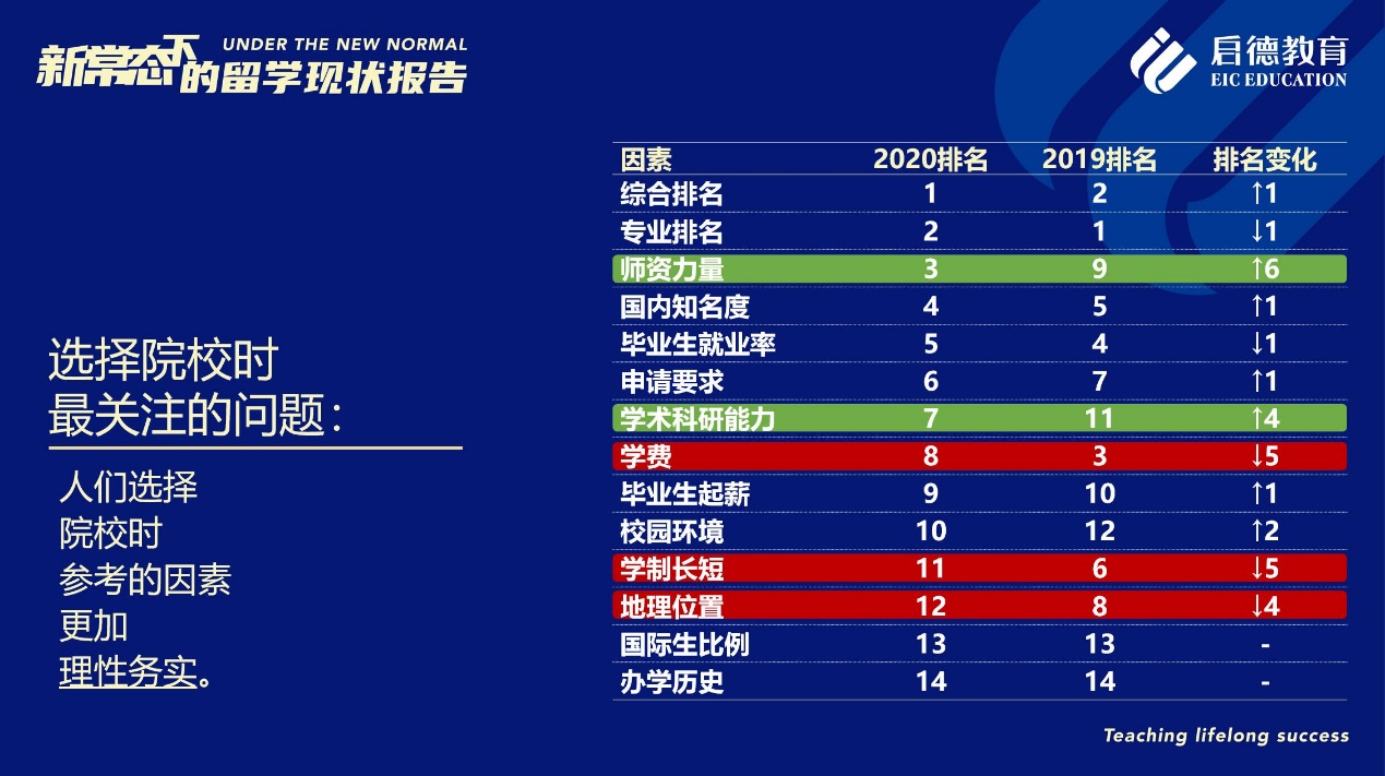 值得關(guān)注的是,在“選擇院校時(shí)最關(guān)注的問題”中,“師資力量”的受關(guān)注度從2019年的第9位上升為第3位,僅次于“綜合排名”與“專業(yè)排名”,“國(guó)內(nèi)知名度”與“畢業(yè)生就業(yè)率”分居第4位與第5位,“學(xué)術(shù)科研能力”從2019年的第11位上升至第7位,而“學(xué)費(fèi)”、“學(xué)制長(zhǎng)短”與“地理位置”等因素分別下滑至第8位、第11位與第12位??梢娫诰蜆I(yè)形勢(shì)尤其嚴(yán)峻的2020年,意向留學(xué)生對(duì)教育質(zhì)量的剛性需求已進(jìn)一步上升,以期在未來的就業(yè)市場(chǎng)獲得更具戰(zhàn)略優(yōu)勢(shì)的國(guó)際競(jìng)爭(zhēng)力。