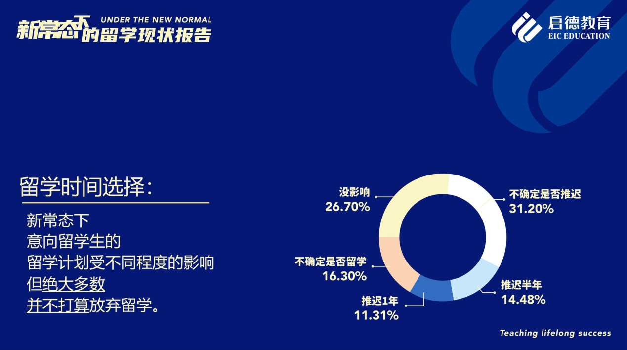 《啟德教育新常態(tài)下的留學(xué)現(xiàn)狀報(bào)告 》調(diào)研數(shù)據(jù)顯示,疫情與國(guó)際環(huán)境疊加的“新常態(tài)”中,意向留學(xué)生的留學(xué)計(jì)劃不同程度地受到了影響,但大部分的意向留學(xué)生并不打算放棄留學(xué),而主要是在時(shí)間規(guī)劃上進(jìn)行了調(diào)整。參與調(diào)研的意向留學(xué)生中,31.2%表示不確定是否推遲留學(xué)計(jì)劃,26.7%表示沒有影響,14.48%將留學(xué)計(jì)劃推遲半年,11.31%將留學(xué)計(jì)劃推遲一年,16.3 %表示不確定是否繼續(xù)留學(xué)(這之中初中階段的學(xué)生較多)。
