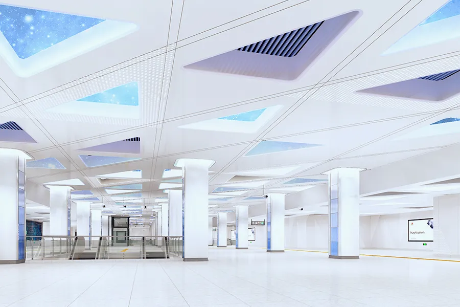 科學(xué)館站位于上步路與深南大道交叉口至濱河大道段,呈南北向布置。與1號(hào)線通道換乘,車(chē)站為地下三層單柱雙跨鋼筋混凝土框架結(jié)構(gòu),共設(shè)出入口6個(gè):E、F,物業(yè)口1、2、3、4。此外,與1號(hào)線換乘通道。