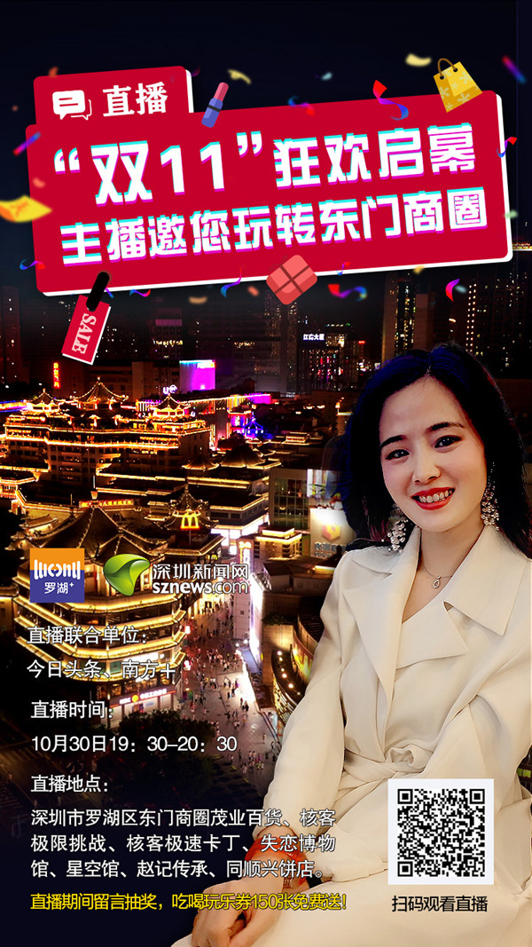 深圳新聞網(wǎng)訊(見圳客戶端、深圳新聞網(wǎng)記者 李慧 劉晨)提前探秘經(jīng)典活動“68小時不打烊”熱潮、體驗(yàn)全亞洲最長的室內(nèi)索道、打卡失戀博物館、7D星空魔幻藝術(shù)館、走進(jìn)手沖姜撞奶的原創(chuàng)品牌糖水店、品嘗深圳特產(chǎn)……10月30日(本周五)晚上7:30-8:30,由深圳新聞網(wǎng)聯(lián)合深圳市羅湖區(qū)融媒體中心共同打造,聯(lián)合今日頭條、南方+直播平臺,為市民開啟東門商圈狂歡預(yù)熱,解鎖“雙十一”嗨購方式,并在直播時段每隔20分鐘抽取一次幸運(yùn)網(wǎng)友,發(fā)放免費(fèi)150張吃喝玩樂禮品券。