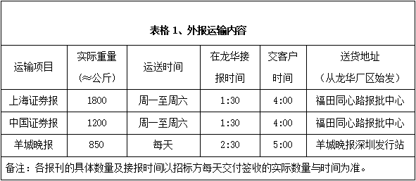 深圳報(bào)業(yè)集團(tuán)印務(wù)有限公司現(xiàn)承印外報(bào)主要有上海證券報(bào)、中國(guó)證券報(bào)、羊城晚報(bào)等重要報(bào)刊,根據(jù)各報(bào)刊的具體要求,安全、準(zhǔn)時(shí)、保質(zhì)、保量地運(yùn)送每天生產(chǎn)發(fā)行數(shù)量的各報(bào)刊到指定地點(diǎn)或客戶手中,具體運(yùn)輸發(fā)行內(nèi)容和標(biāo)準(zhǔn)詳見下面表格。