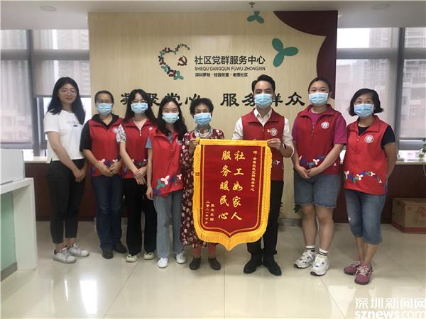 讀特客戶端·深圳新聞網(wǎng)2021年6月28日訊(記者 劉嘉敏 通訊員 楊紀(jì)歐)6月28日上午,79歲的社區(qū)居民張玉芝冒雨來到羅湖區(qū)桂園街道老圍社區(qū)黨群服務(wù)中心,將一面金光閃閃的錦旗,交到老圍社區(qū)黨委副書記黃小龍的手中。錦旗上兩行金光閃閃的大字格外醒目:“社工如家人,服務(wù)暖民心。”
