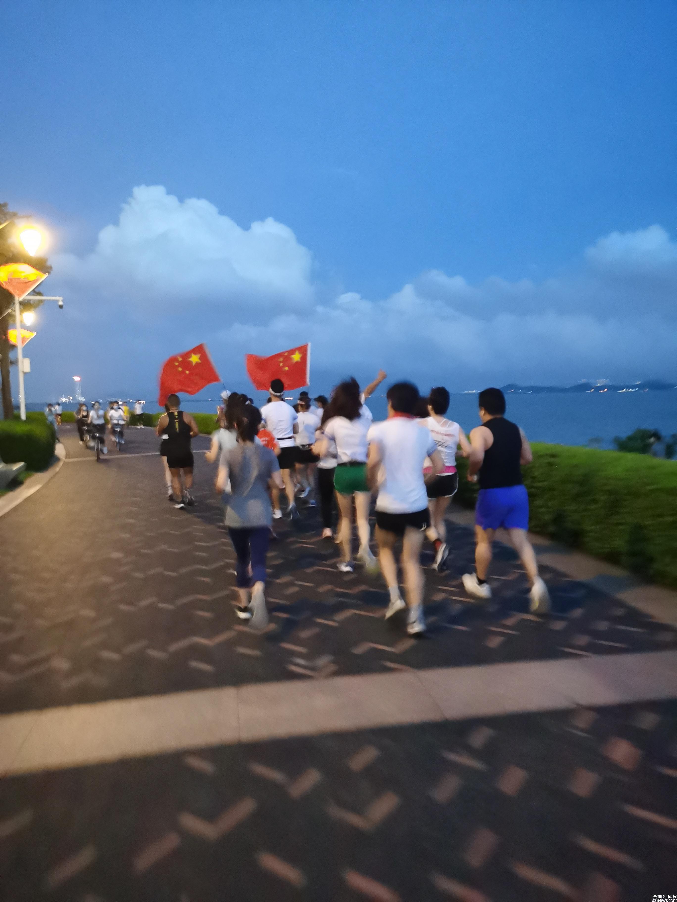 在海風(fēng)習(xí)習(xí)的深圳灣,20個人排成三隊,在紅星紅旗的指引下,踏著統(tǒng)一的步伐,沿著海岸線跑了7.1公里。整齊的隊列,整齊的腳步聲,引起許多路人的關(guān)注和點贊。楊雨晨在心里唱著“沒有共產(chǎn)黨就就沒有新中國”,越跑越有力。