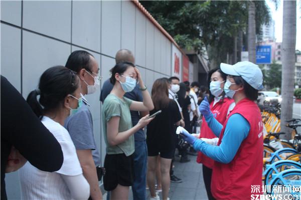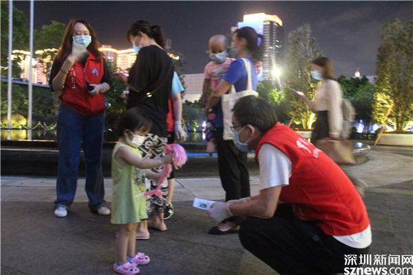 最早到達老圍社區(qū)的下沉干部是羅湖區(qū)財政局副局長朱健全,他一來就遇到了核酸檢測,跟社區(qū)工作人員一起布置檢測現(xiàn)場,協(xié)助居民登記健康碼、出示行程碼。有居民帶著孩子來做檢測,他又臨時當起了保育員,以便孩子的媽媽順利檢測。身穿紅馬甲的他看起來就是一個經(jīng)驗豐富極富愛心的義工。