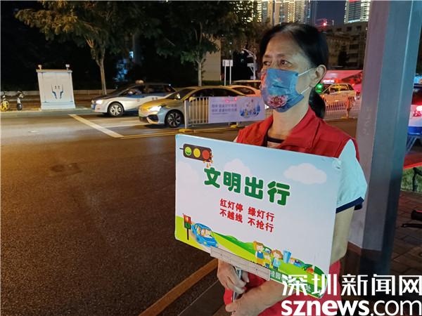 另一位堅守在國慶假期里的義工是宣仲英,今年62歲。她一站兩個小時,始終是精神抖擻,毫不松懈。看到有人試圖闖紅燈,她及時制止。看到有人不走斑馬線,她立刻提醒。她手持勸導(dǎo)文明出行的牌子,就像個交通警察,誰也別想在她的面前犯規(guī)。本來下午6點(diǎn)鐘,正是她給家人做晚餐,同家人一起吃飯的時間,但她聽說社區(qū)創(chuàng)文需要人,就跟家人商量,得到了家人的一致同意。她說,“我從內(nèi)地來到深圳,在老圍社區(qū)住了10年,感覺深圳做義工的氛圍特別濃厚,我也想做義工,為社會發(fā)揮余熱?!?/span>
