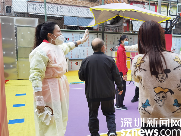 羅湖區(qū)審計(jì)局黨組書記黃吉南在新村社區(qū)防疫現(xiàn)場(chǎng)指導(dǎo)核酸檢測(cè)流程。