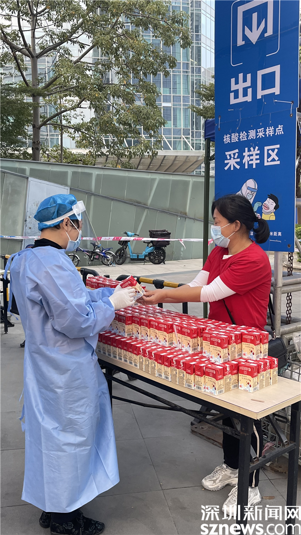 在筍崗街道初心公園核酸檢測(cè)點(diǎn),市民在進(jìn)行核酸檢測(cè)后可以去領(lǐng)取一瓶牛奶。據(jù)了解,這是深圳愛(ài)心企業(yè)專門(mén)為市民和醫(yī)護(hù)人員捐贈(zèng)的,這一瓶瓶牛奶在深圳的冬天向醫(yī)護(hù)人員和市民送上了一份溫暖。