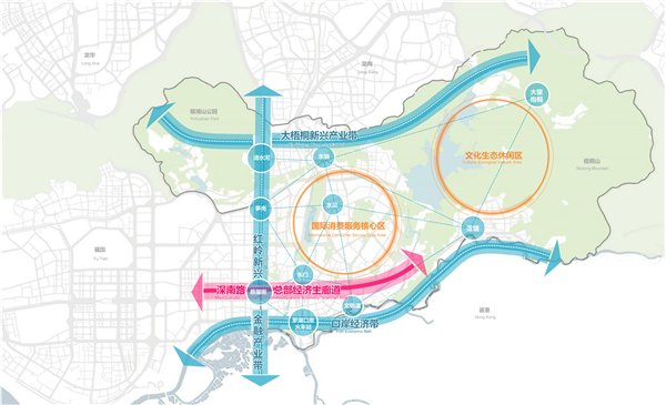 “一主”是以深南東路為中軸線,高起點打造總部經(jīng)濟(jì)主廊道?!皟蓞^(qū)”是高品質(zhì)建設(shè)國際消費服務(wù)核心區(qū)和文化生態(tài)休閑區(qū)?!叭龓А笔歉吣芗壱?guī)劃深港口岸經(jīng)濟(jì)帶、紅嶺新興金融產(chǎn)業(yè)帶和大梧桐新興產(chǎn)業(yè)帶。