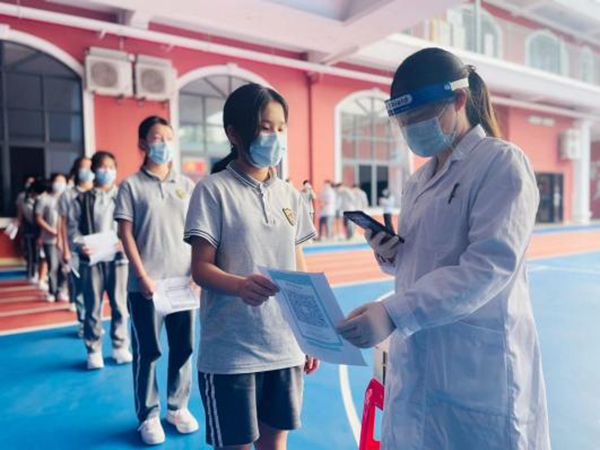 進(jìn)入闊別已久的校園,興奮和激動的心情溢于言表,提前兩天入校的初三年級學(xué)生做出了表率:用餐隊伍一米距,透明隔斷搭建的用餐區(qū)明亮又溫馨;課間時間在班主任的帶領(lǐng)下,大家排隊測核酸,安靜、有序的隊伍讓“大白”對學(xué)生點贊。少年已歸,向陽而生;不忘初心,逐夢而行。這個夏天,老師帶領(lǐng)著學(xué)生們一邊防疫,一邊學(xué)習(xí),合力同行,一起向未來!