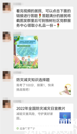 “原來,用滅火器滅火時,滅火器的噴射口應該對準火焰的根部”“電腦著火了,應立即拔掉電源后用濕棉被蓋住電腦,而不是給電腦澆水”“震級相差一級,釋放能量相差約32倍”......微信群里,居民群眾一邊觀看學習視頻,一邊積極分享學習心得、開展熱烈討論。當日,社區(qū)居民李女士連續(xù)作答兩次,均未獲得滿分,不由得感嘆:“這些內(nèi)容看似了解,實操起來還是有點分不清楚,通過學習和答題,重新認識了防災減災的重要性,增長了防災減災知識?!?/span>