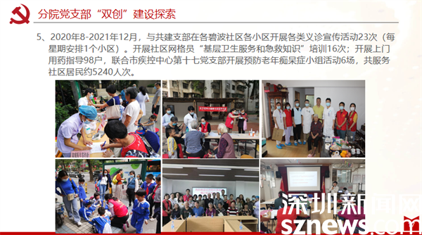 區(qū)中醫(yī)院康復(fù)分院黨支部以黨建引領(lǐng)“雙創(chuàng)”工作取得良好實(shí)效,與黃貝社區(qū)黨委的共建和交叉任職推動(dòng)醫(yī)療資源和社區(qū)服務(wù)的資源共享,把“社區(qū)關(guān)愛服務(wù)”落到實(shí)處。通過黨組織聯(lián)動(dòng),增強(qiáng)了居民與醫(yī)護(hù)之間的溝通聯(lián)系,有力推動(dòng)65歲老人體檢和疫苗接種,大大提升居民認(rèn)可度、滿意度??祻?fù)分院黨支部與社區(qū)黨支部和黨員義工合作,為轄區(qū)內(nèi)70歲以上生活不便孤寡老人提供全方位的關(guān)愛服務(wù),開展上門訪視服務(wù)535人次;深入各小區(qū)開展各類義診宣傳、健康知識(shí)推廣活動(dòng)等36場(chǎng),惠及居民5000余人。
