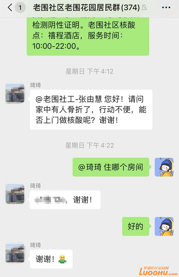 事情還要從7月10日的下午說起,正在家休息的張由慧,看到琦琦在社區(qū)居民群里求助:“@老圍社工-張由慧?您好!請問家中有人骨折了,行動不便,能否上門做核酸呢?謝謝!”張由慧立刻回復(fù):“您的房間號(是什么)?”得到房間號后,張由慧通知社區(qū)網(wǎng)格員肖祥昌協(xié)助核實情況。肖祥昌從網(wǎng)格系統(tǒng)中找到琦琦的聯(lián)系方式,一通電話后,了解到琦琦的孫女不小心崴傷了腳,行動不便,無法下樓做核酸。肖祥昌把情況通報給張由慧,張由慧立刻向社區(qū)黨委副書記黃小龍做了報備。