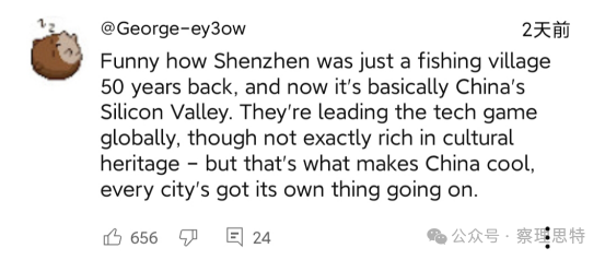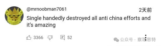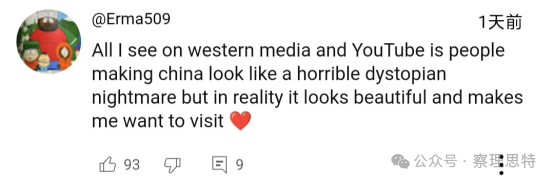 在YouTube上,“單槍匹馬摧毀了所有的反華努力,這太神奇了”“中國被低估了,簡直難以置信”“這次旅行是中國有史以來最好的宣傳”“在我看來深圳是中國最好的城市。有邁阿密的天氣、空氣和景觀,有紐約的摩天大樓,有上海的國際氛圍,有重慶的科技和賽博朋克美學,還帶點廣東味”這樣的感嘆不勝枚舉。