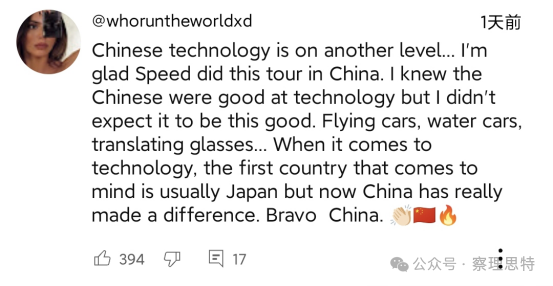 (中國的科技水平又上了一個臺階......我很高興Speed在中國舉辦了這次巡演。我知道中國人擅長科技,但我沒想到會這么好。飛行汽車、水上汽車、翻譯眼鏡......說到科技,首先想到的國家通常是日本,但現(xiàn)在中國真的做出了改變。中國萬歲?。?/p>