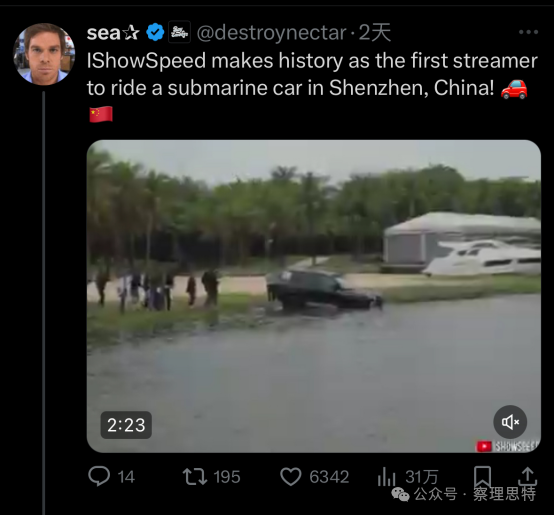 (IShowSpeed 創(chuàng)造了歷史,成為第一個在中國深圳乘坐潛水艇車的流量博主?。?/p>