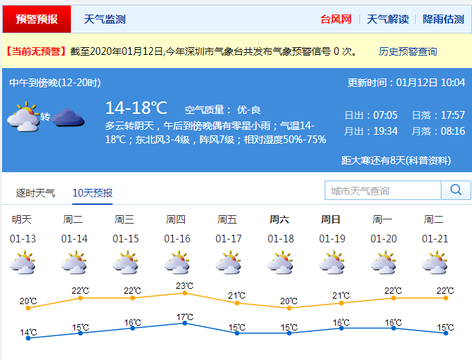 今天起深圳氣溫逐漸回升,17日-19日冷空氣影響,氣溫小幅下降。