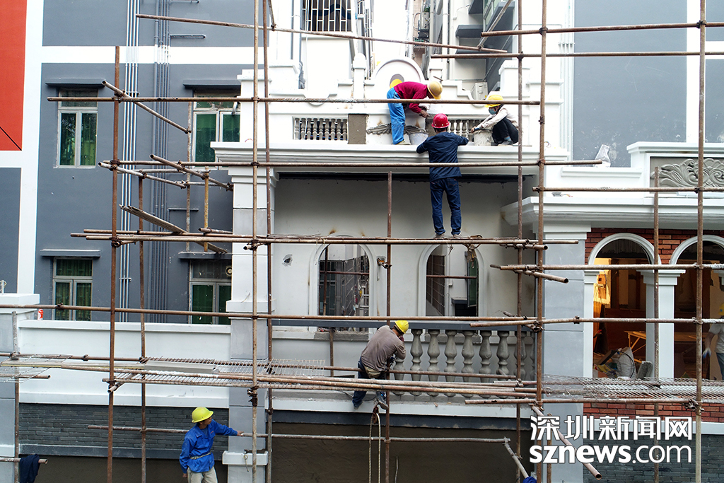 12月14日下午,建筑工人對(duì)水圍村民房進(jìn)行外立面改造