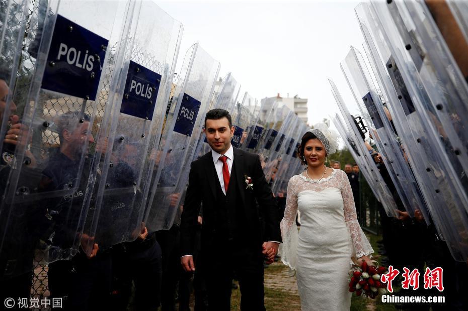 當(dāng)?shù)貢r間2018年3月21日,土耳其安塔利亞,警官Ceren Ekici和Taha YasinGul舉行婚禮。在10個月前的一次行動中,Taha YasinGul不慎開槍擊中Ceren Ekici的頭部,所幸沒有造成生命危險。他們的婚禮由警局同事操辦,同事們舉著防彈盾牌,護(hù)送這對新人走向禮臺。圖片來源:視覺中國
