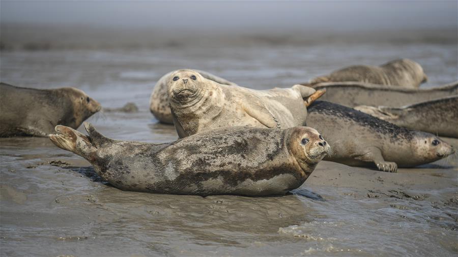 3月25日,一群斑海豹在遼寧盤錦雙臺河口三道溝海域的灘涂上休息。新華社記者潘昱龍攝